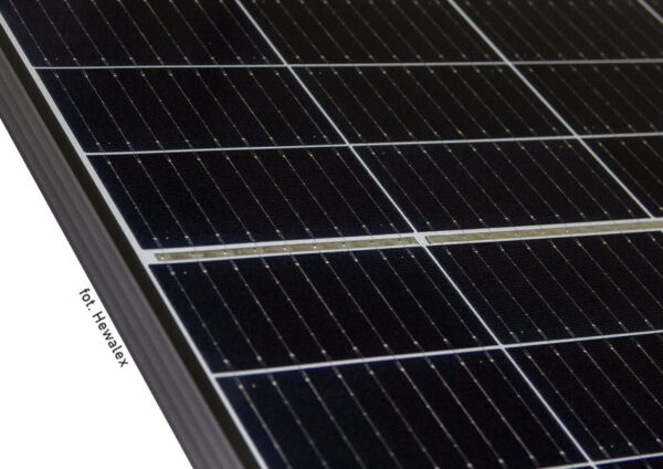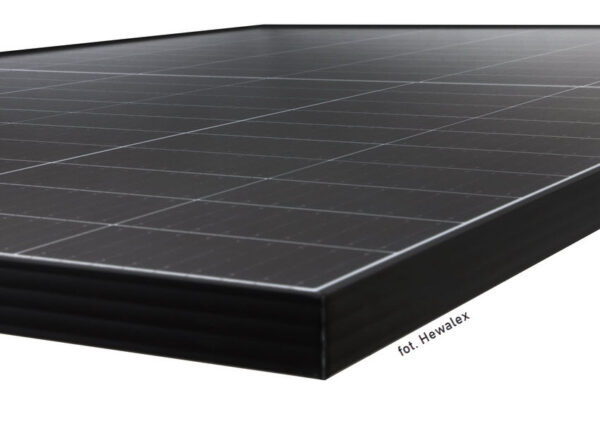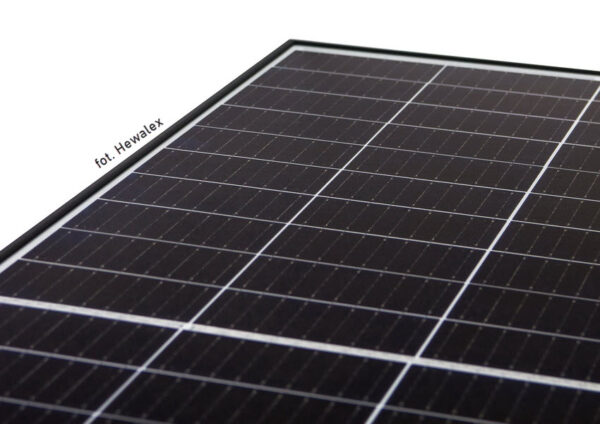 UWAGA: Panel ma inne rozmiary od standardowego o mocy 380W lub 385W. Posiada czarne obramowanie o grubości 30 mm, polecamy dla niego zamawianie dostosowanych do niego docisków środkowych i skrajnych w CZARNYM KOLORZE.