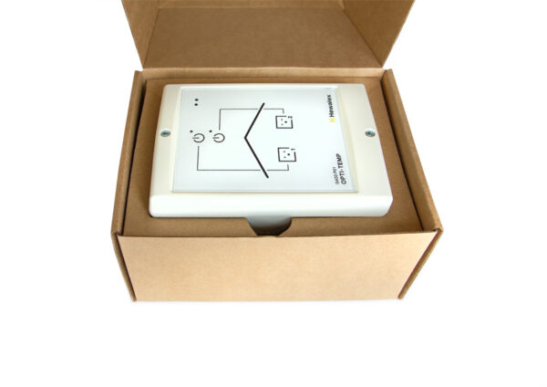 Moduł OPTI-TEMP stanowi opcjonalne rozszerzenie systemu OPTI-ENER pozwalając na sterowania pracą grzałki elektrycznej w podgrzewaczu ciepłej wody użytkowej lub innego elementu grzejnego. Moc grzałki jest płynnie regulowana – maksymalnie do mocy 2000 W. W ten sposób moduł OPTI-TEMP pozwala wykorzystywać bieżące zmienne nadwyżki energii elektrycznej wytwarzanej w instalacji fotowoltaicznej. Dodatkową funkcją modułu jest rozszerzenie ilości sterowanych urządzeń elektrycznych za pomocą 2 styków beznapięciowych. Całkowita liczba sterowanych poprzez styki urządzeń elektrycznych wynosi wówczas 6 (OPTI-ENER: 4 + OPTI-TEMP: 2).