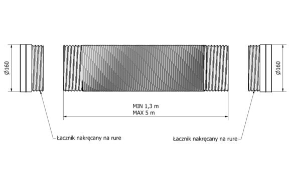 Przewód elastyczny służy do transportu powietrza w systemie instalacji zasysającej i wydmuchującej powietrze z pompy ciepła. Przy montażu należy zwrócić uwagę, aby przewód był maksymalnie naciągnięty. Rura o maksymalnej długości (po rozciągnięciu) 5 m nadaje się do cięcia na krótsze odcinki. W zestawie znajdują się dwa łączniki przewodu elastycznego DN160 i dwie mikrogumy samoprzylepne 5 mm do nałożenia na króciec dn150.